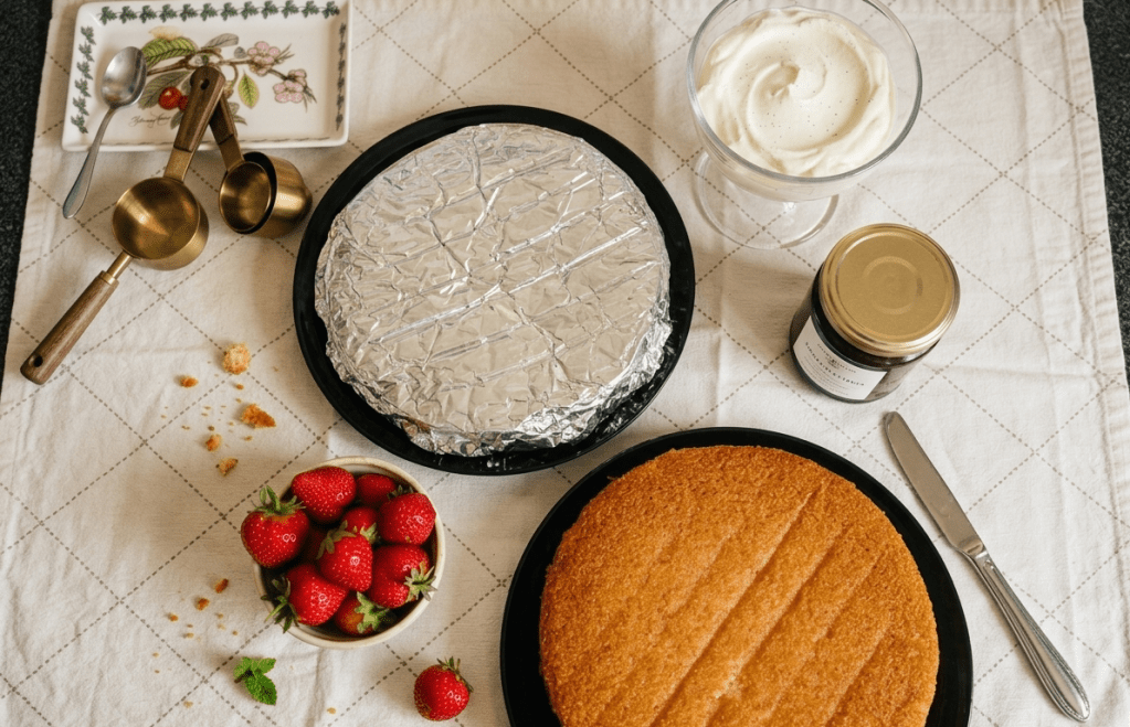 Whip the cream to soft peaks; reserve 2–3 tbsp for the top. Spoon the remaining cream into the centre and gently spread it out towards the strawberries, keeping a slight mound in the middle (it’ll level under the second layer).
